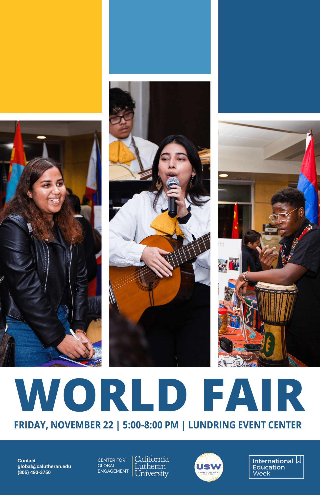 Hosted by the United Students of the World the World Fair is a unique opportunity for Cal Lutheran and the broader community to come together in celebration of our our vibrant global campus! Individuals showcase the beauty and diversity of various countries for attendees
