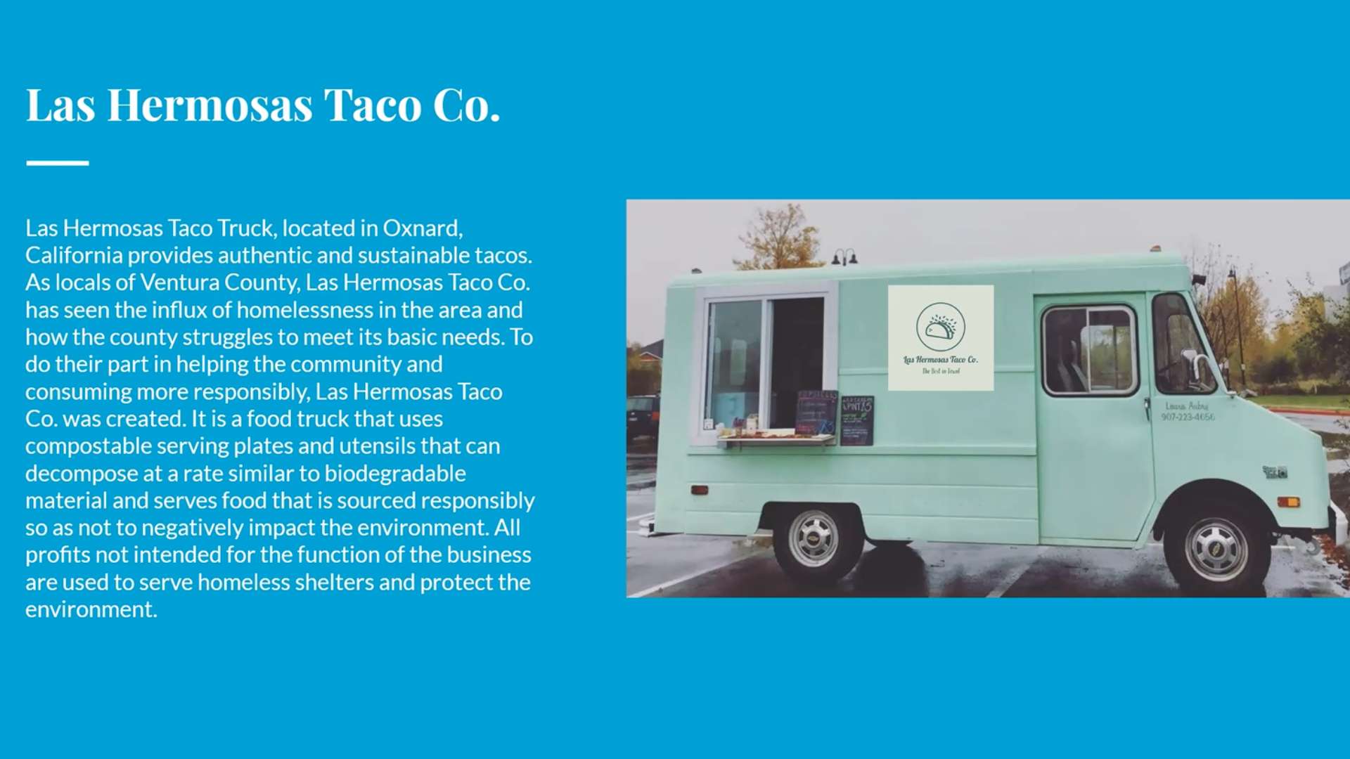 There comes a time when businesses need to care not only about their profit but the environmental cost their actions bring, and that time is now. Las Hermosas Taco Co., LLC. provides authentic, fresh, and sustainable tacos through a taco truck in the Ventura County area. The food industry, the food truck industry specifically, is highly competitive. Customers who care for a local and sustainable meal that carries a meaningful message will help the business persevere!