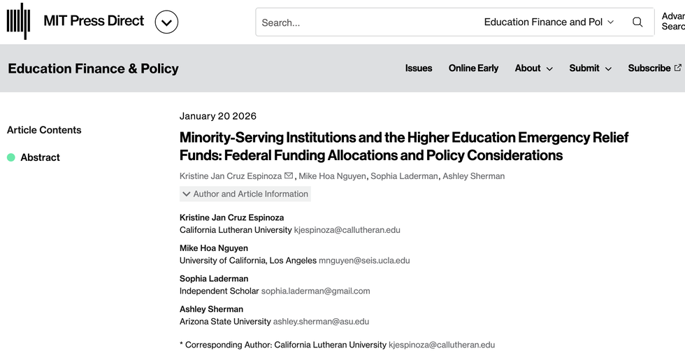 Kristine Jan Cruz Espinoza, Ph.D. (Graduate School of Education), published a co-authored peer-reviewed paper entitled, "Minority-Serving Institutions and the Higher Education Emergency Relief Funds: Federal Funding Allocations and Policy Considerations," in Education Finance and Policy alongside Mike Hoa Nguyen, Ph.D. (UCLA), Sophia Laderman, Ph.D. (Independent Scholar), and Ashley Sherman, Ed.D. (Arizona State University).