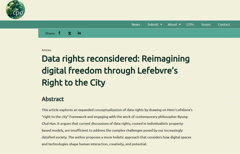 This article explores an expanded conceptualization of data rights by drawing on Henri Lefebvre’s “right to the city” framework and engaging with the work of contemporary philosopher Byung-Chul Han. It argues that current discussions of data rights, rooted in individualistic property-based models, are insufficient to address the complex challenges posed by our increasingly datafied society. The author proposes a more holistic approach that considers how digital spaces and technologies shape human interaction, creativity, and potential.