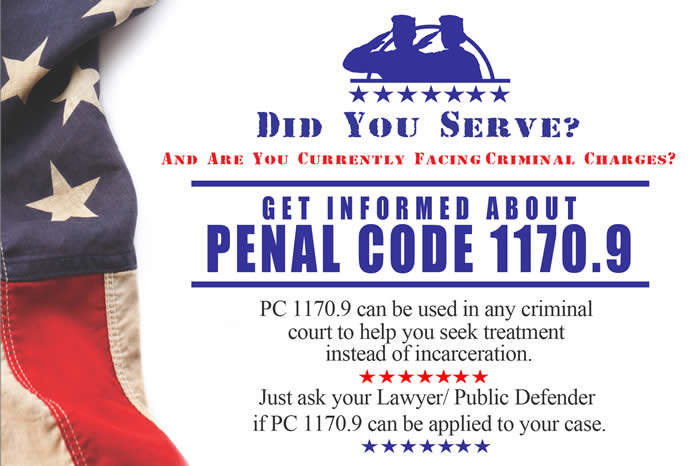 Penal Code 1170.9 may be applicable to your case if you are facing criminal charges to help you seek treatment instead of incarceration. Download Information Brochure (PNG).